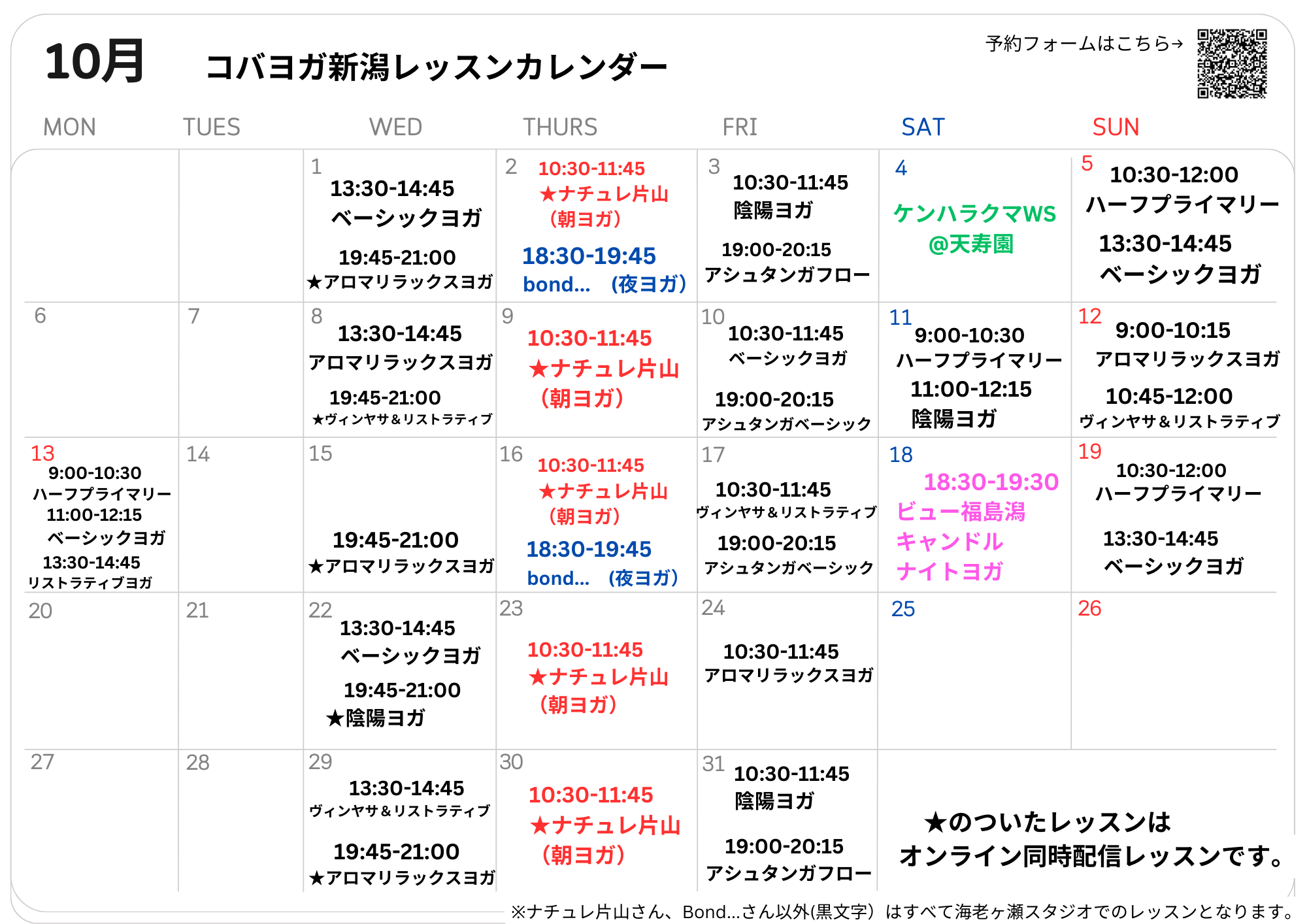 小さなスタジオになります為、各クラス定員がございます。スケジュールカレンダーをご確認いただき、既にご予定が決まっている方は、お早めにご予約下さい。