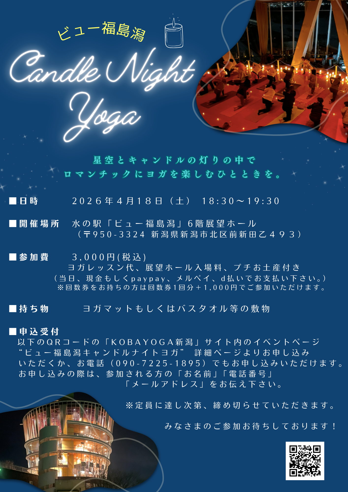 2026年最初のコバヨガ新潟のイベントは新潟市北区にございます水の駅「ビュー福島潟」6階展望ホールにて第6回キャンドルナイトヨガをおこないます!福島潟を一望する壮大な夜景とキャンドルの灯りの中で一緒に心地よくヨガをしましょう。